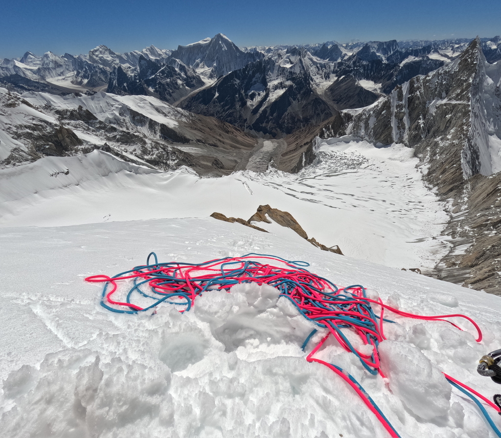 Alarm 1:00 a.m. — by 3:00 we were moving out from the bivy. The route began with easy snow slopes, gradually steepening into several pitches of 70–80° ice. We climbed this section deliberately early, before sunrise, to avoid rockfall. After a few pitches the line veered left, gaining the safety of a buttress. The higher we got, the steeper it became. Pitch by pitch we moved upward — solid mixed climbing, mostly around M5, and with heavy packs and thin air it was no joke. Aside from a few looser sections, the climbing was on perfect golden granite — pure Karakoram gold, the stuff you dream about. Nepal can only envy rock like this. By mid-afternoon we reached our planned bivy — a snowy ridge where we hoped to carve out a tent ledge. The headwall above looked intimidating, so we decided to stop there. After an hour of chopping, we had a beautiful ledge for our two-person tent — tight for three, but comfortable enough. The night was calm.